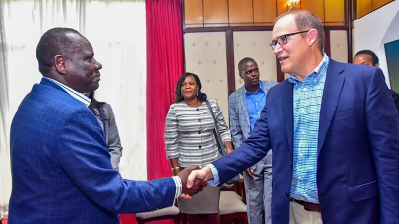 Christel House President and CEO David Harris (Right) is welcomed by His Excellency Dr. Jonathon Bii Chelilin E.G.H., Governor, in Eldoret, Kenya during a visit to one of six countries under consideration as expansion locations for two new Christel House schools.